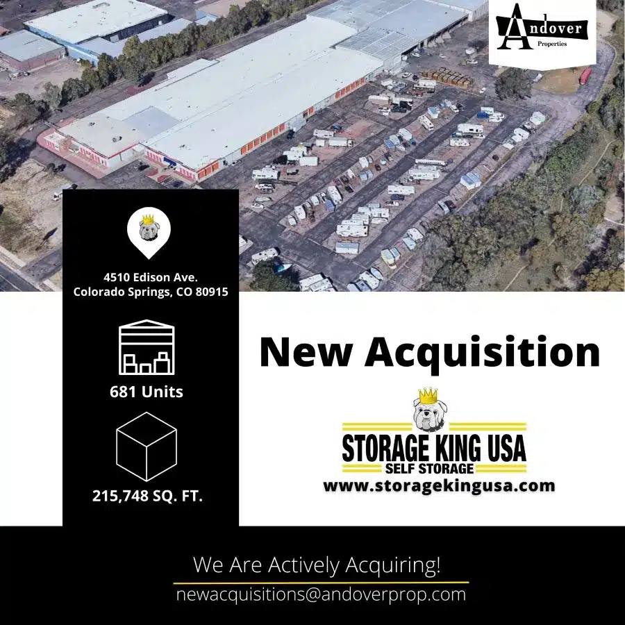 COLORADO SPRINGS, CO – August 22, 2023 – Andover Properties is pleased to announce the acquisition of a 215,748 SF self-storage facility in Colorado Springs, CO. The facility, previously operated as AAA Platte Self Storage, will be rebranded under Andover’s Storage King USA brand.